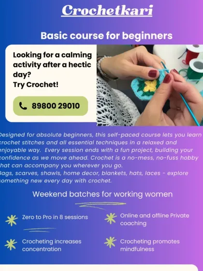 I'm an ex-banker passionate about sharing the calming art of crochet. I offer personal classes for beginners in English, Hindi, and Marathi, alongside my handmade creations.