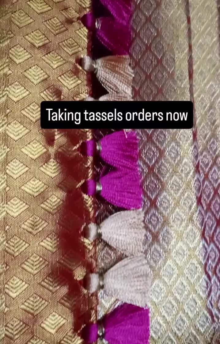 I add handcrafted tassels, or kuchu, to give your saree a unique and finished look. I don't use one-size-fits-all designs; instead, we'll choose a pattern and colors that complement your specific saree. I use high-quality silk threads to ensure the tassels are durable and beautiful.