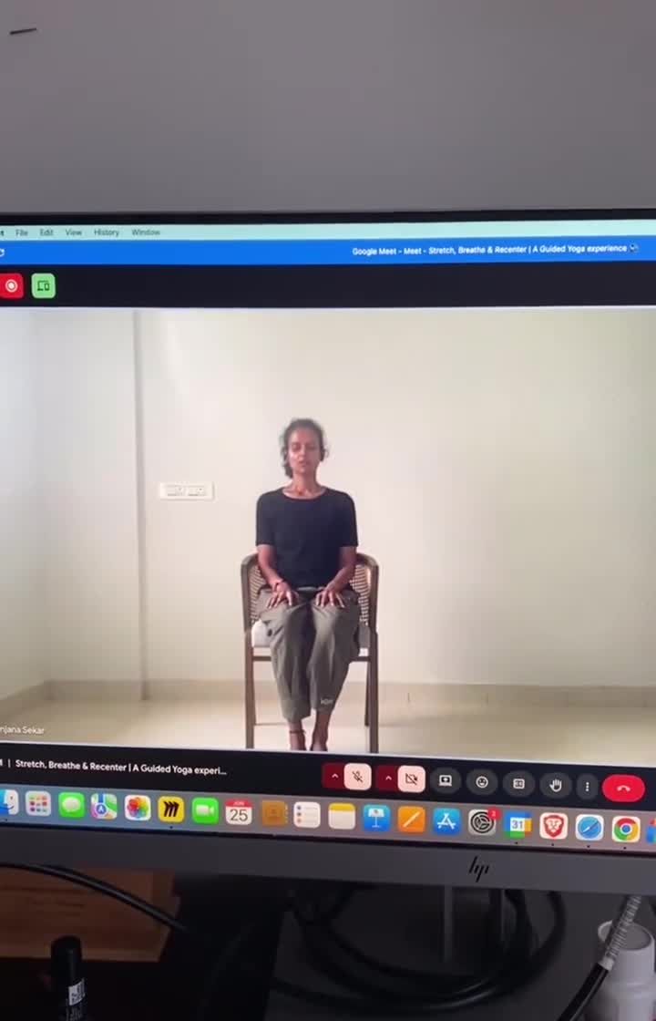 I offer practical yoga and mindfulness sessions designed for the workplace, available both online and in-person in Bengaluru. These include simple chair yoga stretches to relieve desk-related strain and guided relaxation techniques like Yoga Nidra to reduce stress and improve focus.