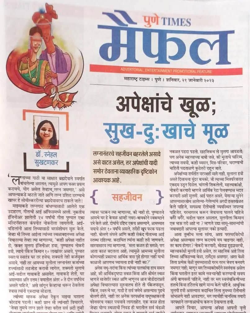 I frequently share my analysis on marriage and relationships in leading publications like Maharashtra Times and Tarun Bharat. These articles explore common issues such as managing expectations ('Apekshanche Khul') and the dynamics of modern partnerships ('Sahjeevan').