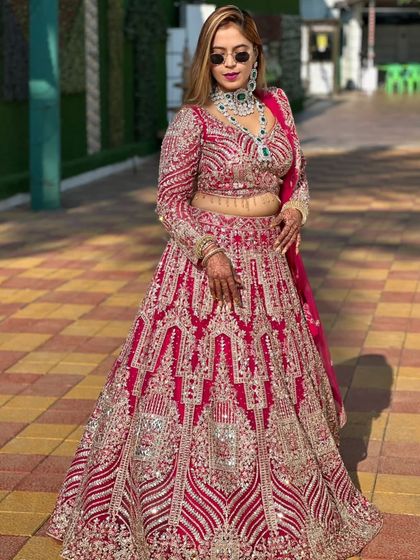 For your most special day, find your dream bridal lehenga without the commitment of buying. My collection includes everything from traditional red velvet and zardozi work to modern pastel and mirror-work designs, complete with matching jewellery sets available for rent.