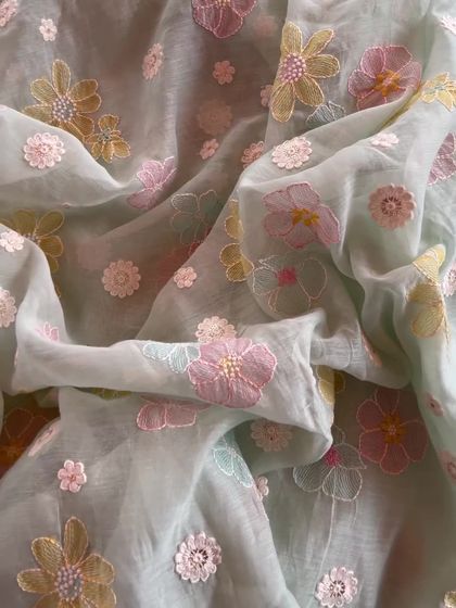 Discover our collection of light-as-air fabrics. We offer sheer organza with sequin and appliqué work, traditional Lucknowi georgette, and featherlight Mul Chanderi, perfect for creating layered looks, sarees, and dupattas.