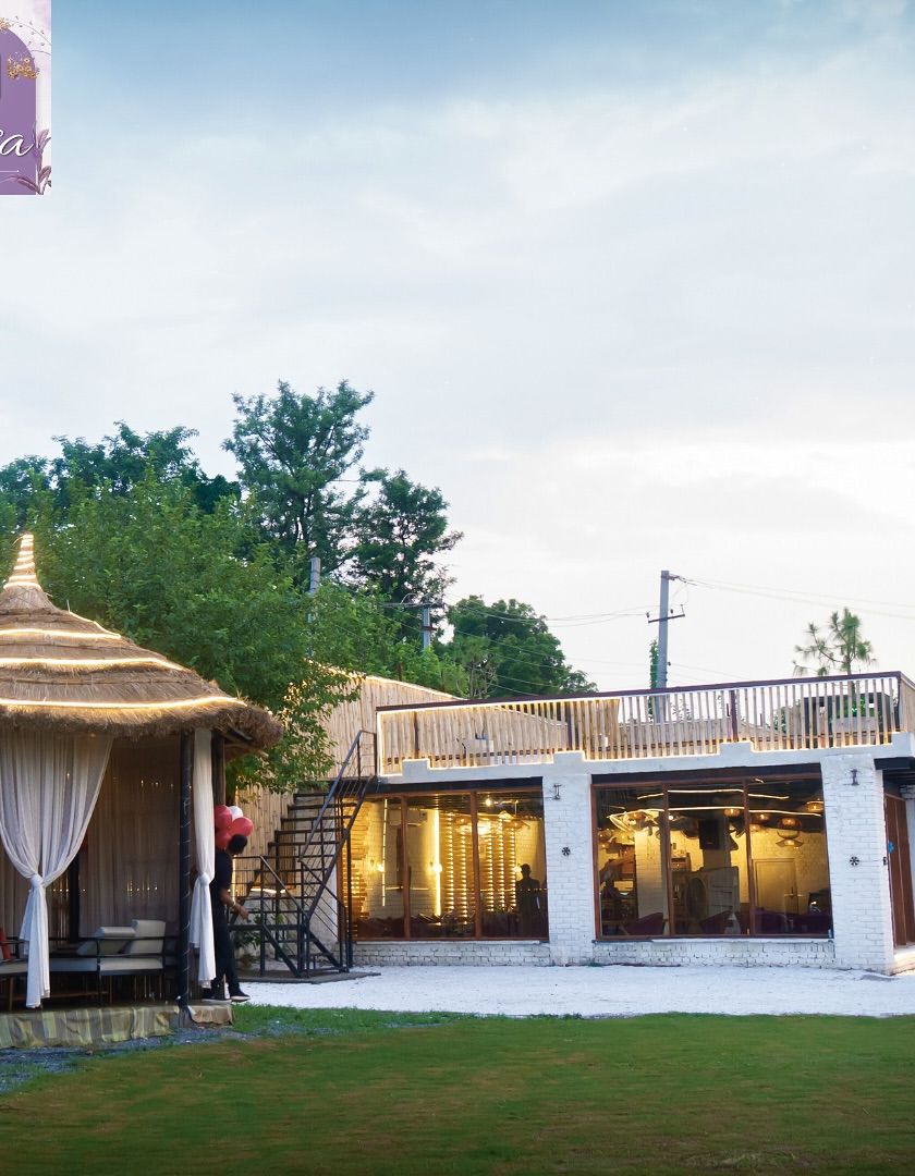 I offer a variety of spaces to match your event's vibe. Choose from private bamboo cabanas for intimate gatherings, open green lawns for larger events, and a chic indoor hall with glass windows for dining or moving the party inside.