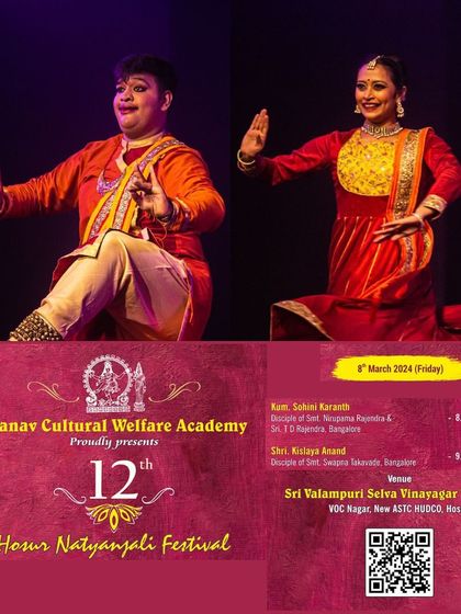 Performances - We hit big stages—Sangeet Natak Akademi, Hosur Natyanjali. Students get to shine, like in our 'ARAMBH' show.