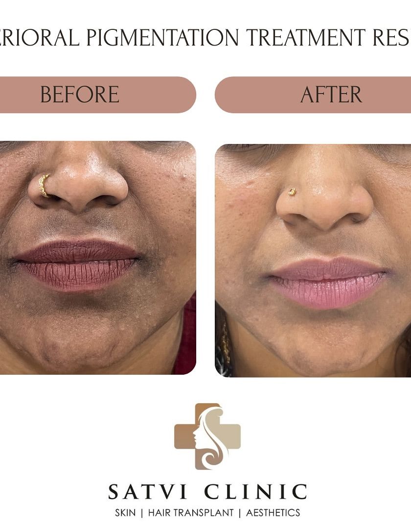This section showcases results for pigmentation concerns like melasma and perioral melanosis. My approach is always to start with an accurate diagnosis to identify the underlying cause, followed by a tailored treatment plan using depigmenting agents, chemical peels, and strict sun protection guidance.