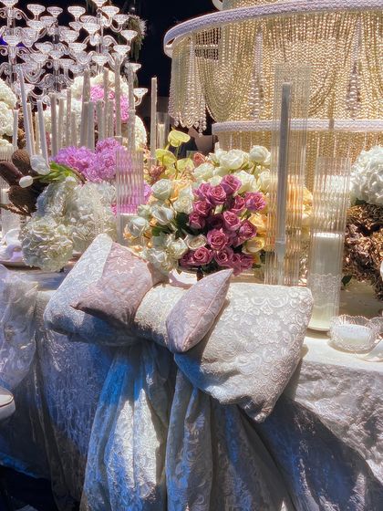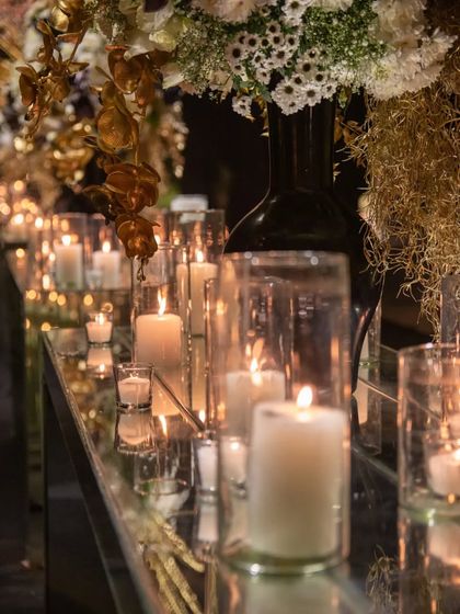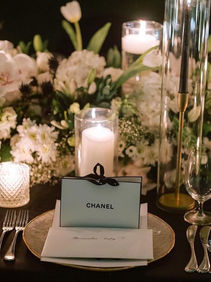 - Tablescapes: This is our jam. Mirrored tables, velvet runners, candles everywhere. We sweat the details, so every place setting, centerpiece, and tiny object fits the mood.
