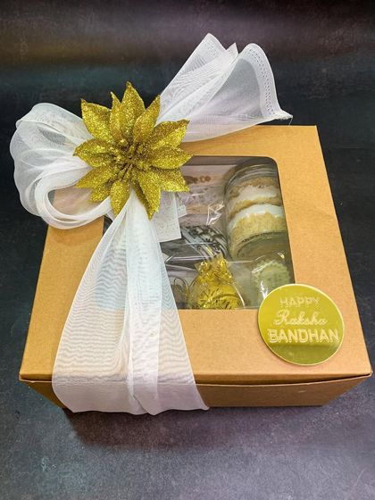 My gift hampers are a complete, ready-to-give solution for festivals like Raksha Bandhan. Each box is packed with a variety of my homemade desserts, including cakesicles, jar cakes, brownies, and specialty chocolates, along with traditional festive items.