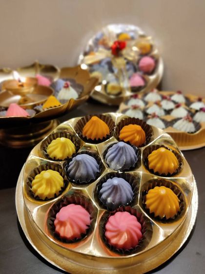 For Ganesh Chaturthi, I create a special range of treats that serve as beautiful and delicious offerings. My collection includes everything from a stunning Modak-shaped cake to handcrafted chocolate modaks available in ten distinct flavors.