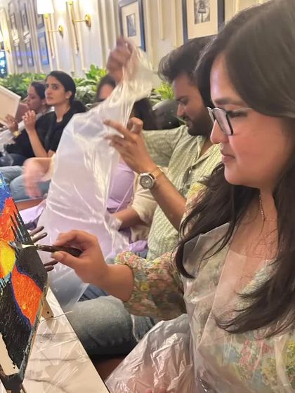 I bring all art supplies and set up a painting session at your place in Bangalore, guiding everyone step-by-step so your group can relax and create together, no art experience needed.