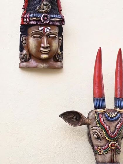 We handcraft powerful three-dimensional wooden masks and busts of deities. These pieces, featuring gods like Shiva, Vishnu, and Ayyanar, are designed to be mounted on a wall, bringing a strong spiritual and artistic presence to your space. They are available in various sizes and finishes, including vibrant multicolor and antique looks.