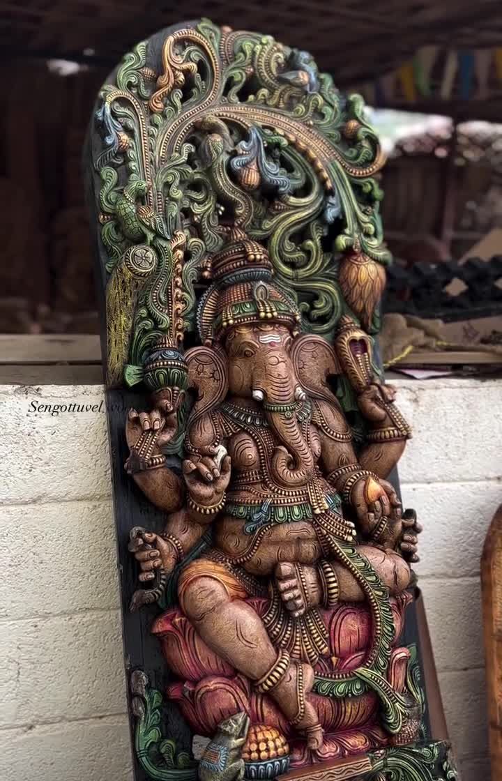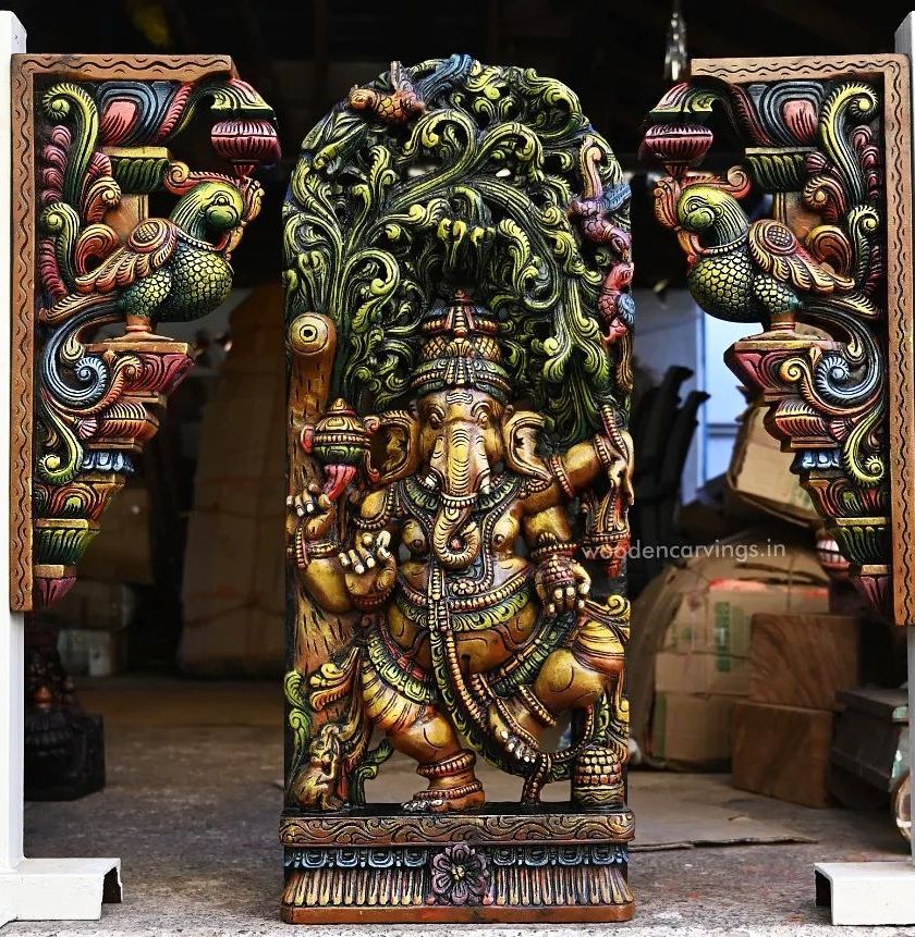 We offer a wide variety of Lord Ganesha carvings, one of our most requested deities. This collection includes freestanding statues, wall panels, and vertical compositions like the Ashta Ganesha, available in vibrant multicolored finishes, classic wax brown, and raw natural wood.