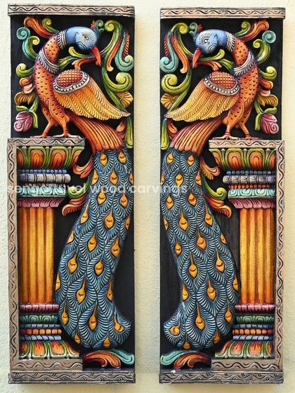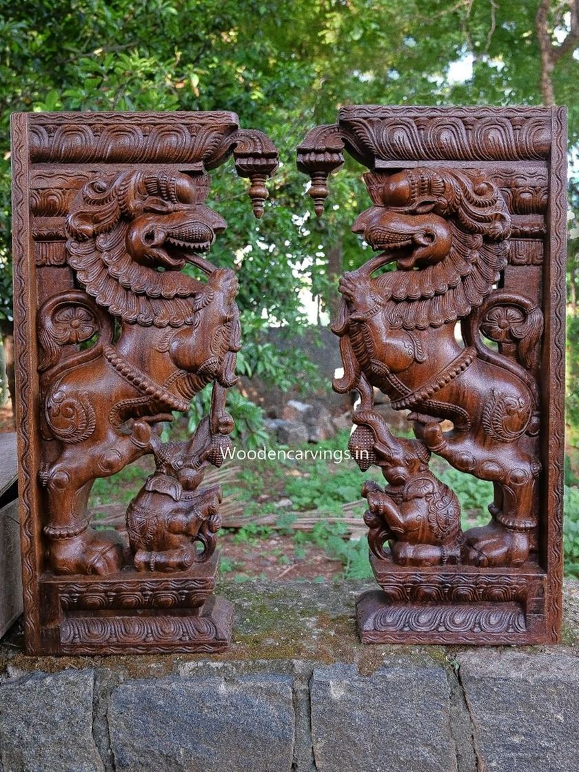 This collection features carvings of mythical beings like the powerful Yaali, the graceful Hamsa, and celestial Apsaras, as well as decorative architectural pieces like brackets and mirror frames. These items add a touch of tradition and artistry to any part of the home, from entryways to living rooms.