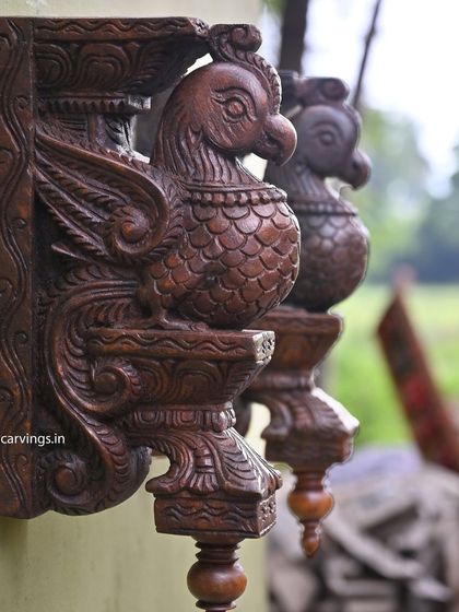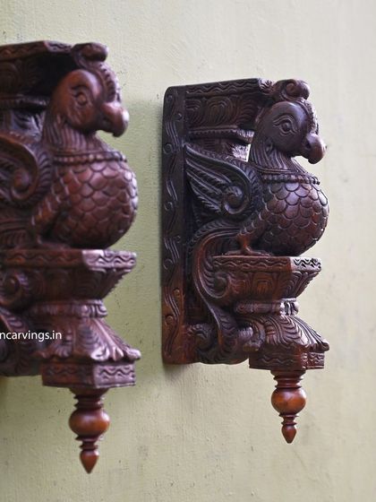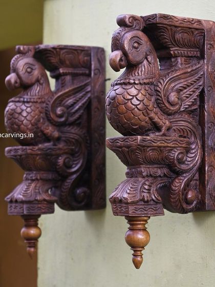 We specialize in handcrafted wooden wall brackets featuring traditional designs like Yaazhi hooks and elephant brackets. Our wall brackets combine decorative aesthetics with functionality, featuring intricate carvings and detailed motifs. The Yaazhi hooks come in paired designs with dome fixings, while our elephant brackets include charming details like tiny bells.
