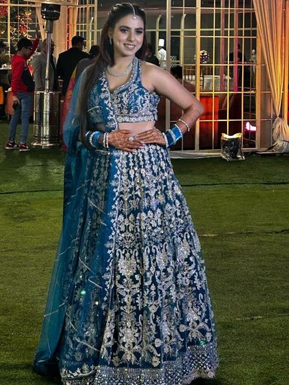 We offer intricately designed bridal lehengas featuring heavy embroidery, sequins, and detailed embellishments. Our collection includes traditional and designer pieces in various colors like maroon, pink, blue, and teal.