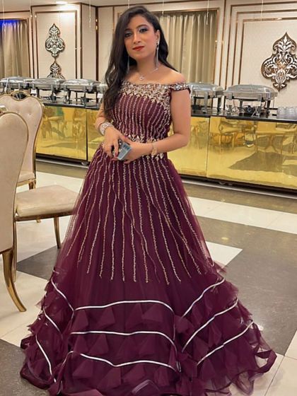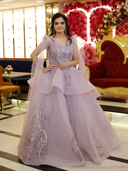 We offer premium designer gowns for special occasions, featuring intricate beadwork, elegant embroidery, and luxurious designs. Our collection includes formal and bridal gowns in various colors like maroon and lavender, with detailed embellishments and layered styles.