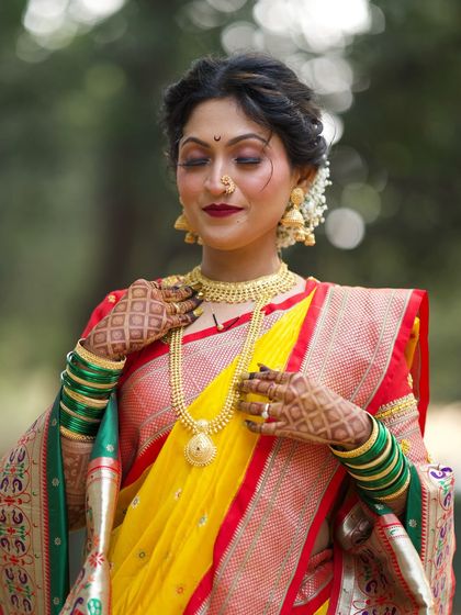 I handle your makeup, hair, and Nauvari saree draping with all traditional Maharashtrian accessories for every wedding event, so you get a complete and authentic bridal look without hassle.