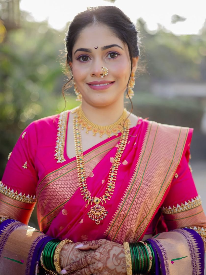 This is my specialty and my passion. I create complete, authentic Maharashtrian bridal looks, including traditional makeup with the iconic chandrakor bindi, expert Nauvari and Paithani saree draping, and classic hairstyles adorned with flowers or jewels. Each look is customized to make my bride feel like a queen on her wedding day.