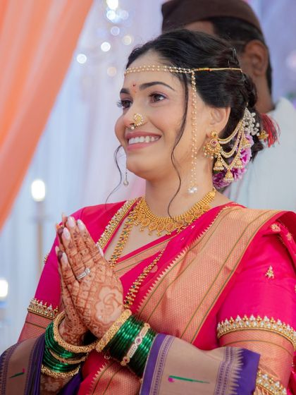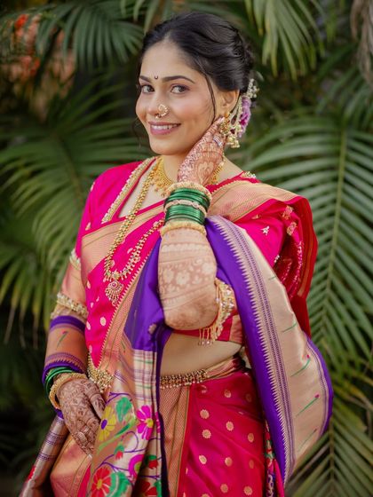 I specialize in traditional Nauvari saree draping, ensuring a perfect, comfortable fit that lasts all day. Whether it's a classic Brahmani style or a royal Peshwai look, I make sure the drape enhances your entire bridal presence.