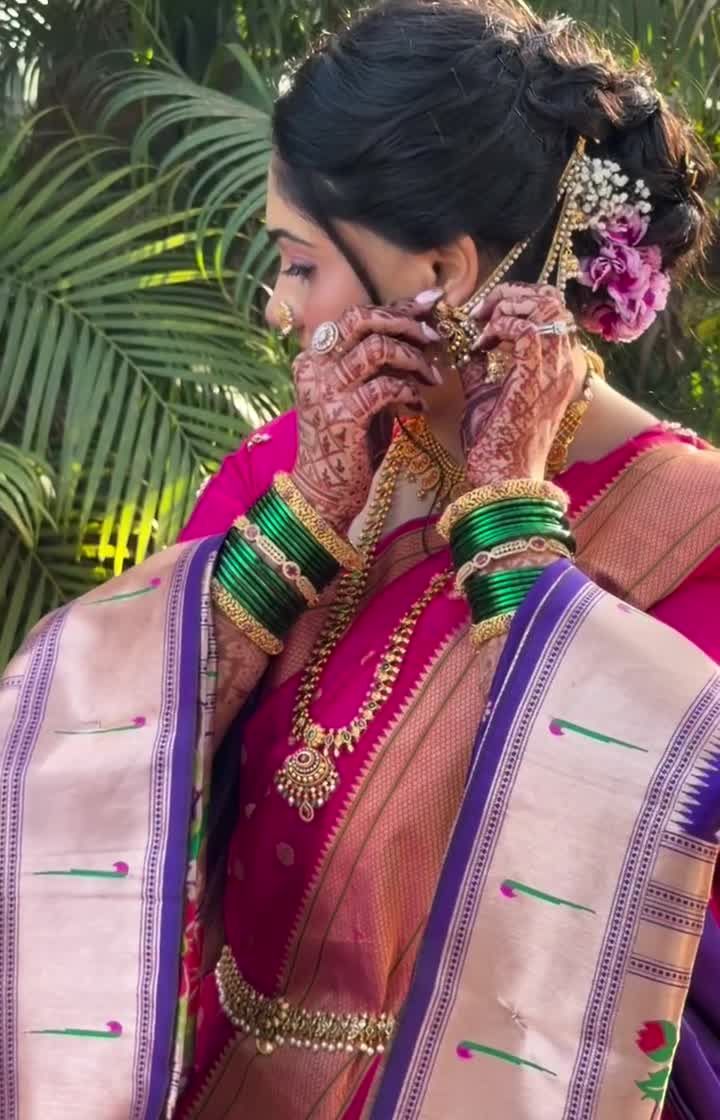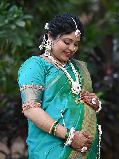 Celebrating the special journey to motherhood with a traditional Dohale Jevan look. I create a radiant and comfortable style for the mom-to-be, complete with beautiful floral jewelry and elegant saree draping.