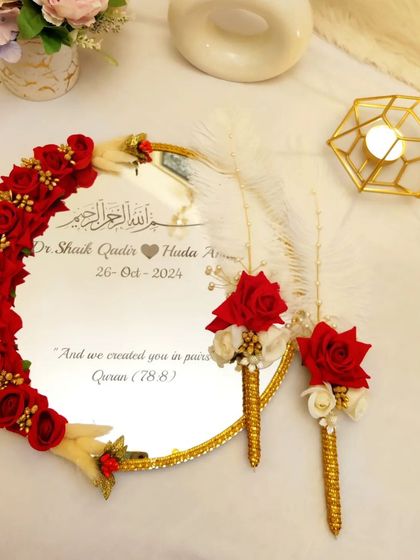 Handmade Wedding Accessories - I create custom Haldi platters, floral jewelry, Nikah certificates, mirrors, dupattas, bridal clutches and more.
