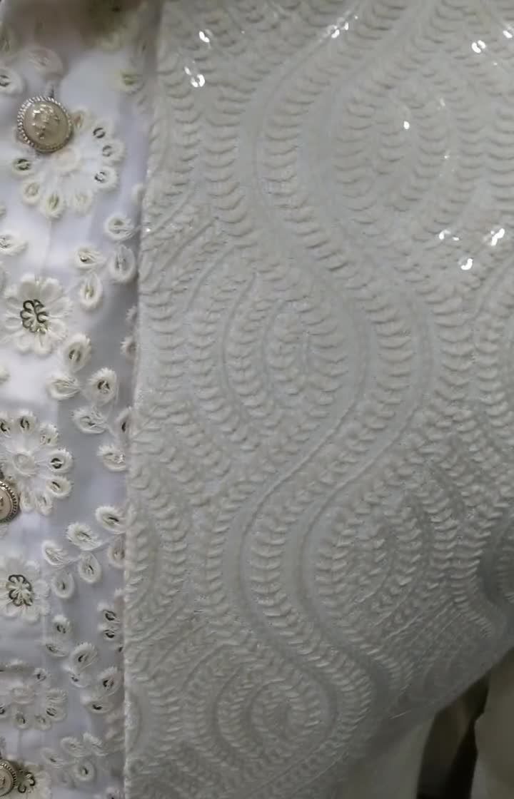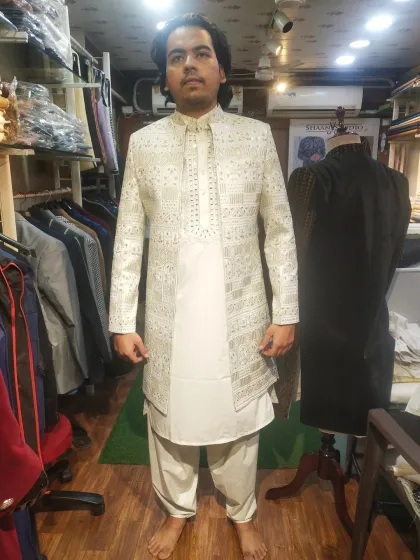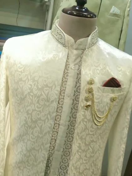 Discover our range of bespoke sherwanis, from timeless classics to bold, contemporary designs. We use luxurious fabrics like velvet and jacquard, embellished with detailed embroidery, sequins, and unique patterns for your wedding day.