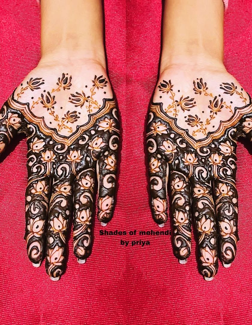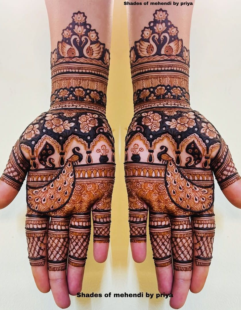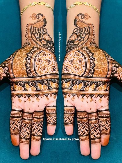 This is my passion, creating full, detailed mehendi that covers the hands and arms for your big day. My designs often feature traditional motifs like peacocks, elephants, and lotuses, using negative space to make the figures pop.