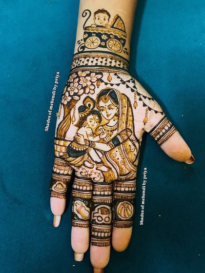 Celebrate the journey to motherhood with a special mehendi design. I create heartwarming designs featuring cute baby elements like footprints, cradles, toys, and portraits of the expecting parents. It's a beautiful way to bless the baby and mother.