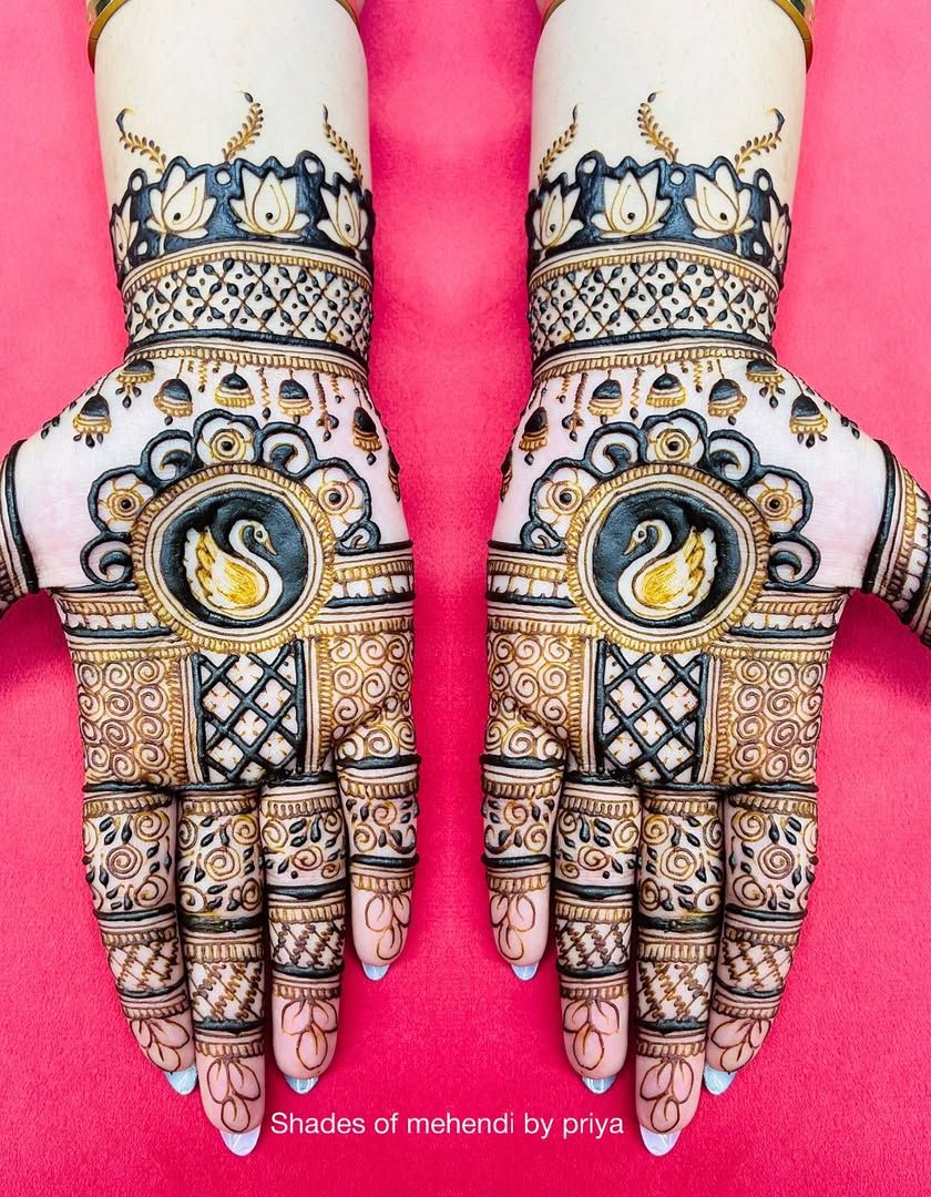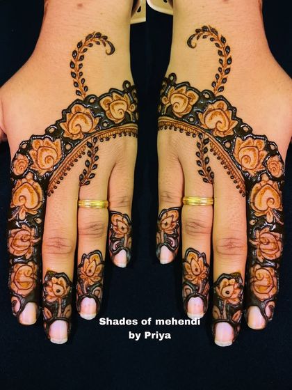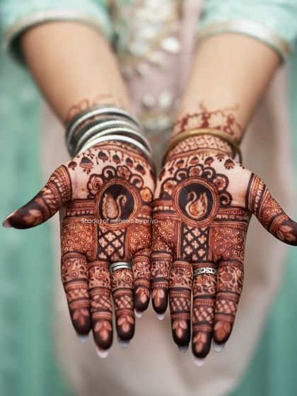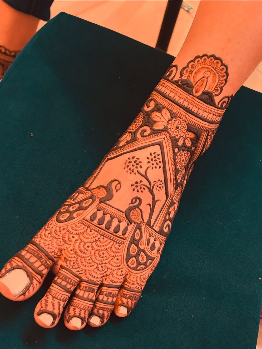 For your big day, I create dense, detailed mehendi that is rich with tradition and personal touches. I offer full bridal packages that include designs for both hands and feet, featuring motifs like peacocks, elephants, florals, and personalized couple initials.