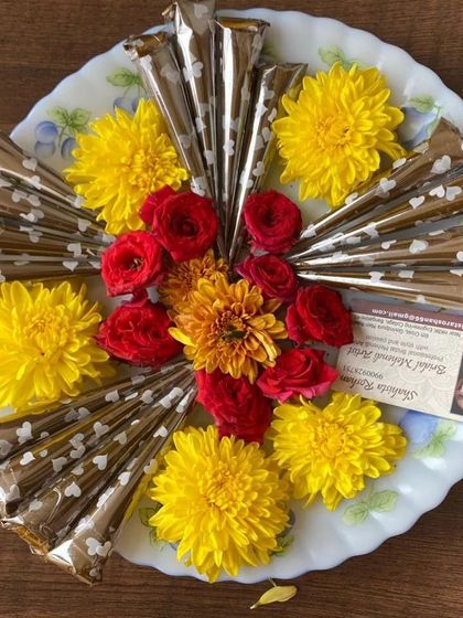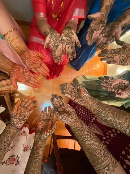 I create custom mehndi designs for brides and groups using fresh organic henna, and I come to your location in Bangalore for a relaxed ceremony.