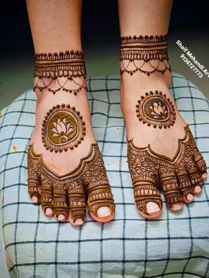 I do full-coverage bridal mehandi for hands and feet, with custom designs and personal touches like hidden names or wedding dates.