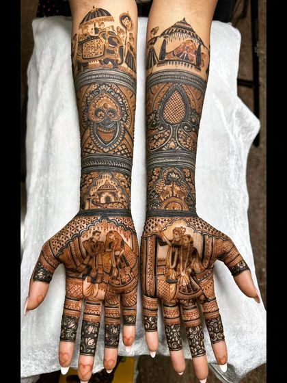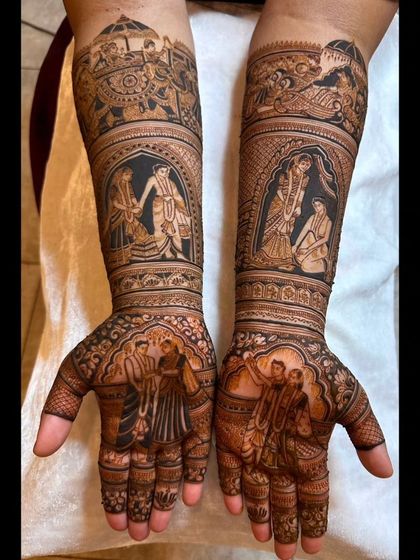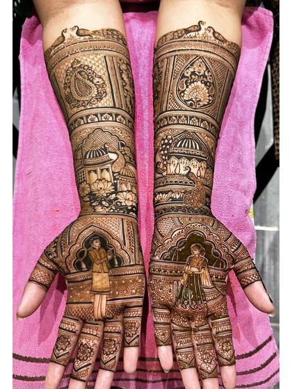 I design bridal mehendi with custom portraits and wedding stories, cover hands and feet in detail, use only natural henna, and travel anywhere for your big day.
