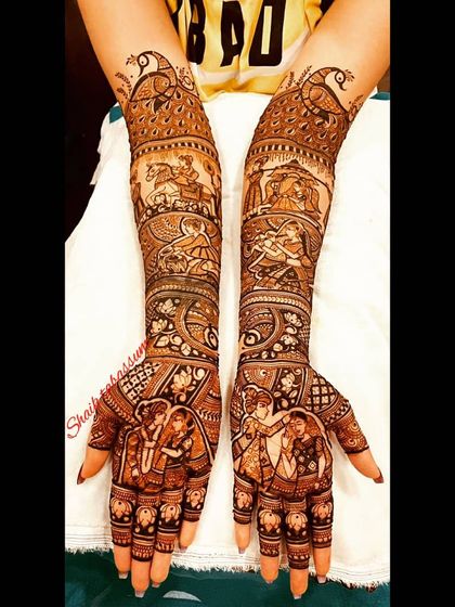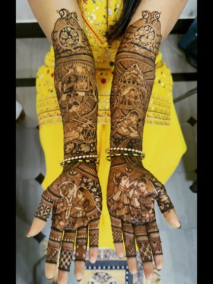 I specialize in creating elaborate and intricate bridal mehendi designs, covering hands, arms, and feet. My designs incorporate traditional motifs like paisleys, florals, and personalized elements such as initials, dates, and portraits.
