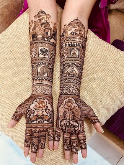 Custom Storytelling Designs - I create storytelling mehendi designs with personal themes, portraits, and wedding scenes.