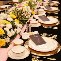 We believe the dining environment is as important as the food itself. This gallery showcases our meticulous attention to detail in creating sophisticated atmospheres, from grand buffet presentations to intimate and luxurious table arrangements featuring our signature black, red, and gold themes.