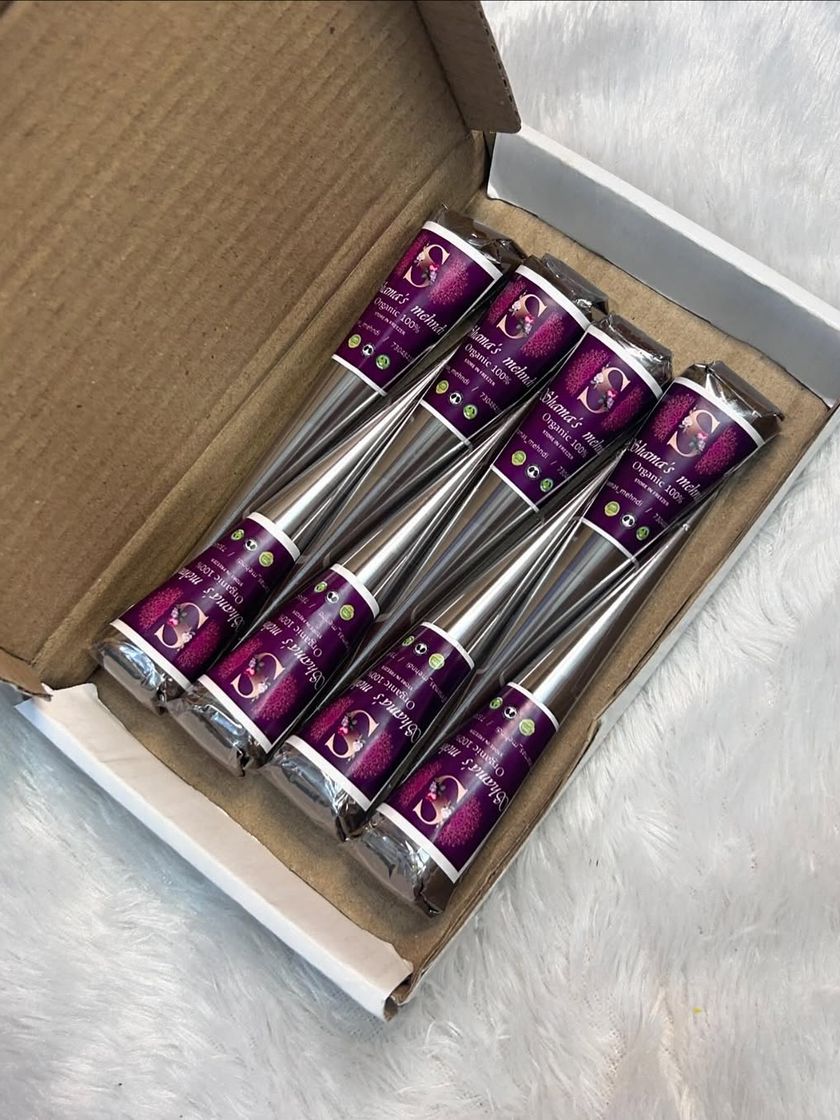 These are the cones I make myself and use for all my clients, including brides. Each cone is 100% organic, mixed with essential oils for a dark stain, and sealed for freshness. The paste is stringy and smooth for perfect draping, and the fine tip allows for incredibly detailed work without clogging.