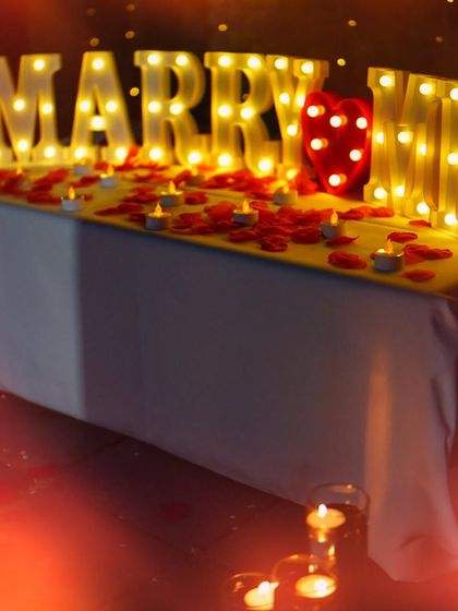 - Romantic proposal decoration - think red roses, candle-lit walkways, and those big ‘MARRY ME’ letters.