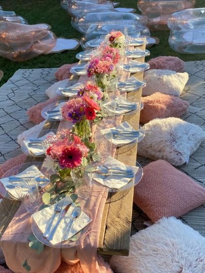- Boho picnic setup with floor seating, pampas, fairy lights.