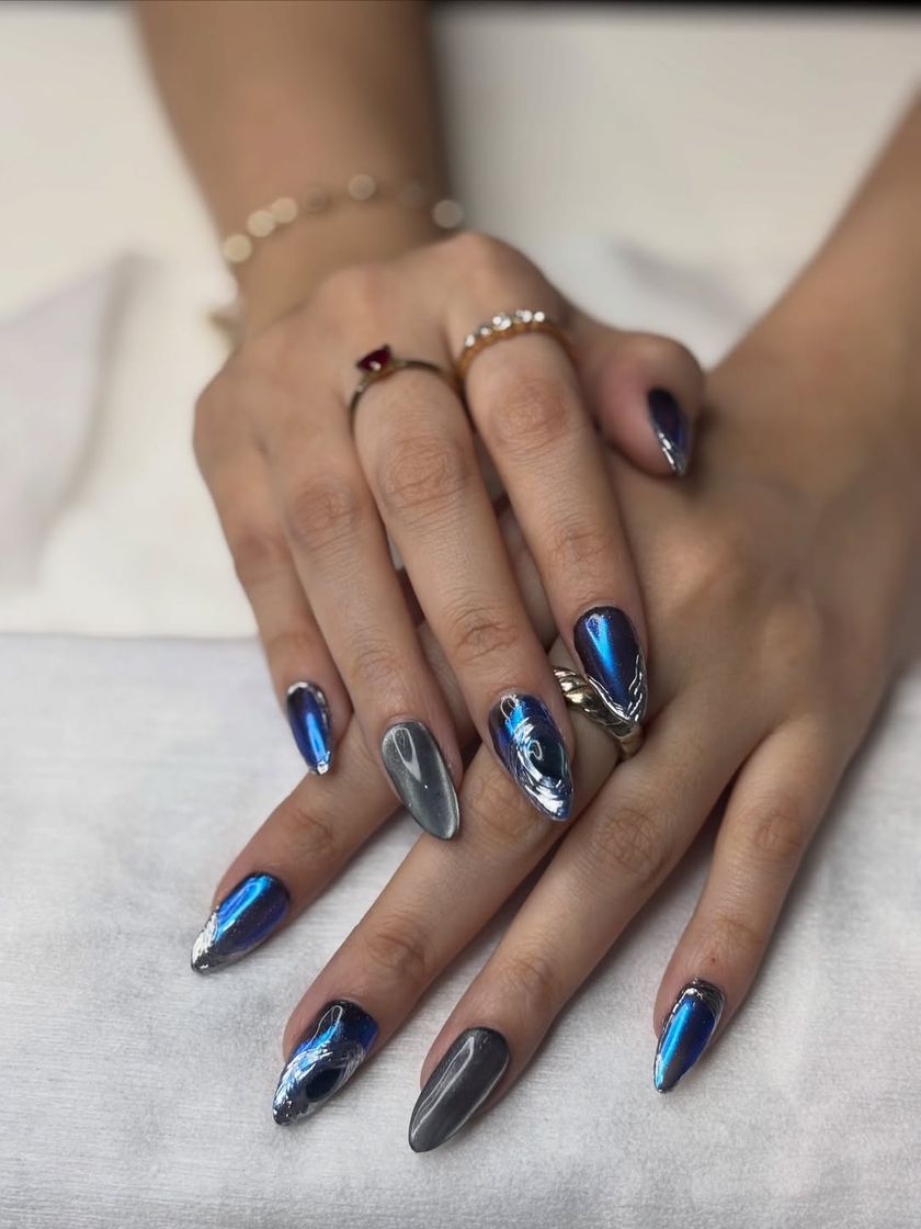 I love working with chrome because the result is pure magic. From classic silver that looks like liquid metal to iridescent colors that shift in the light, I make sure the finish is flawless and reflective. This is for you if you want your nails to make a statement.