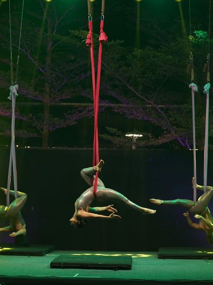 We perform and choreograph aerial acts for events, offer custom fusion routines, and help you create or learn your own aerial piece using silks, hoop, and hammock.
