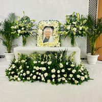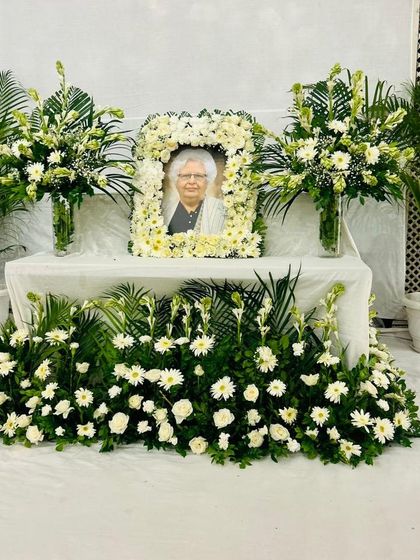 I provide complete floral setups for Shraddha ceremonies, prayer meetings, and memorial services. These arrangements typically include a decorated central table, a fresh flower garland for the photo frame, and surrounding bouquets, all designed to create a calm and respectful environment. I use only fresh white flowers like rajnigandha, gladiolus, roses, and chrysanthemums for these occasions.