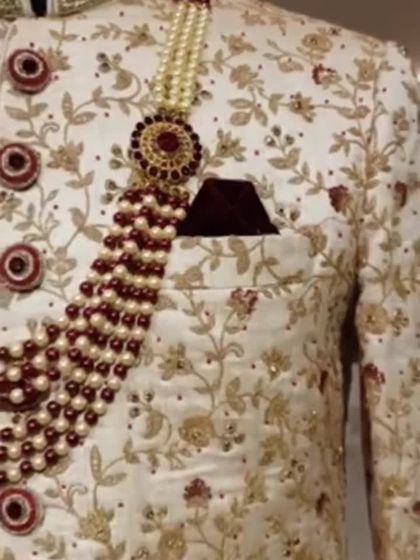 This is my specialty. I have a huge collection of sherwanis for the main wedding day, from classic ivory and gold to rich maroons and reds. You can find heavy embroidery, zardozi work, and simple, elegant designs, all available to rent or buy.