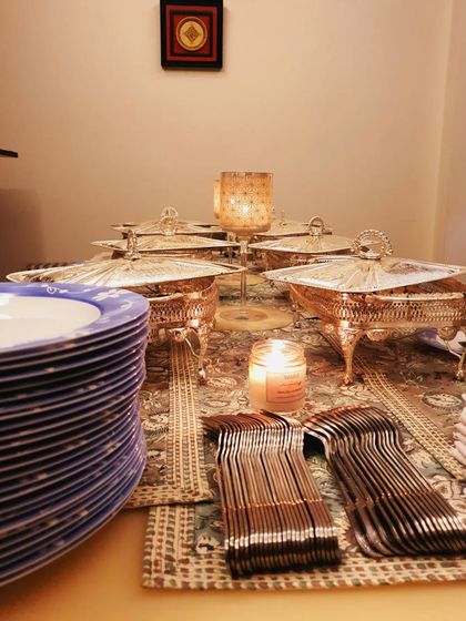 I handle all the details of the food presentation so you don't have to worry about a thing. My service includes elegant serveware like copper and silver plated dishes, tablecloths, and full cutlery sets to make your home party feel special.