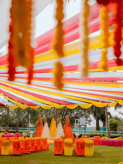 - Pre-wedding: Haldi and Mehendi get that full-on desi colour with marigolds and quirky props. Sangeet? Expect glam - crystal backdrops, fairy light wedding decor, and lounges for chilling.