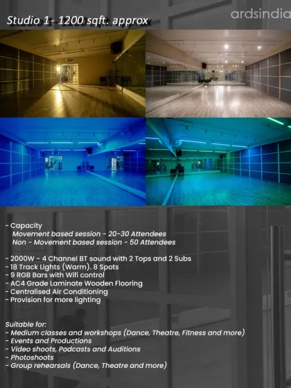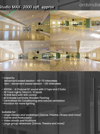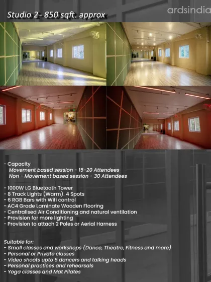 Dance Studio Rental Bangalore - Studios for rent - shoot, rehearse, teach, or just vibe. Three sizes, pro sound, lighting, wooden floors.