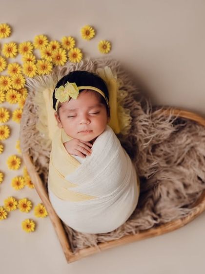 These sessions are for capturing the serene, sleepy moments when your baby is just a few days old. Using gentle swaddling, soft wraps, and a variety of props like baskets and floral arrangements, I create artistic portraits of your 'nanhi si gudiya' in my safe and comfortable Andheri studio.