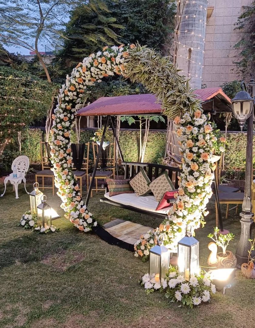 For outdoor functions, I can create romantic and chic atmospheres. This includes beautiful garden swings (jhulas) inside floral arches, rustic table centerpieces, and modern photo booths with pampas grass and custom signs.