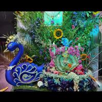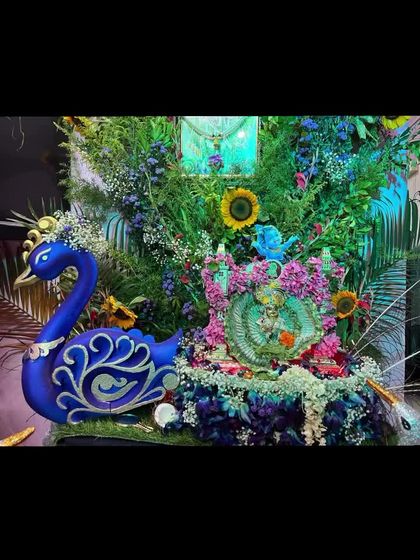 My floral art extends to other festivals and special poojas throughout the year. I can create themed decorations, like this peacock basket for Janmashtami, to bring a unique and creative touch to any divine celebration.