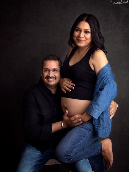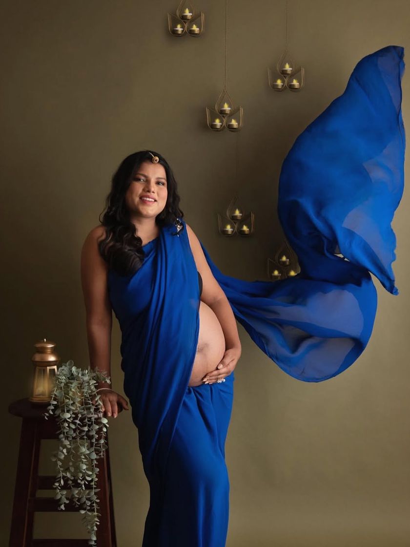 For the love of tradition! A saree maternity shoot is a beautiful way to celebrate your journey. We can style it with props like diyas for a classic, elegant look in the studio.