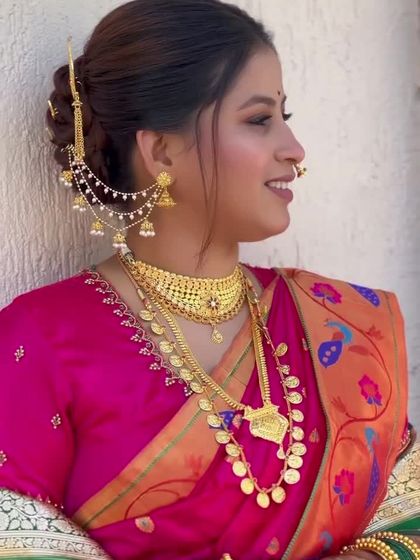 I specialize in creating timeless Maharashtrian bridal looks, from the iconic Nauvari saree drape to the traditional crescent bindi. This gallery showcases a variety of styles, including classic red and green Paithanis, vibrant yellow sarees for vidhi ceremonies, and royal blue ensembles, all tailored to make you feel like a queen.