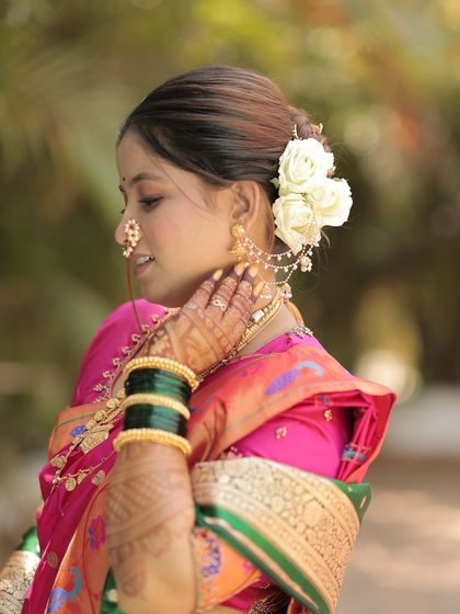 I specialize in creating authentic Maharashtrian bridal looks with soft, dreamy glam that enhances natural beauty. My service includes complete bridal makeup coordinated with traditional elements like nauvari saree styling and accessories such as green bangles, maang tikka, and floral arrangements.